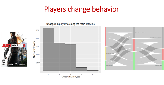 We can from these profiles extract useful information about how people are playing the game at the time of the analysis. Essentially, each of these profiles is an profile is an expression of a playstyle, and it allows us to draw some inference about player interest also. For example, the ”Driver” profile: drives, flies, sails – all the time and favors maps with vehicles. The ”Assassin”: kills – afar or close – but never uses vehicles, even on very large maps. Tend to favor small maps. The ”Target dummy” are the unskilled novices and they have a high dropout rate unless they quickly transfer to another cluster. However, as mentioned, snapshot profiles have limited shelf life, because players change their behaviour. What this means is that we do not play the same game in the same way, throughout our whole interaction history with the game. Here is a concrete example of this from the open-world action game Just Cause 2: The middle diagram shows the number of behavioural profiles, here determined using Archetype Analytics, that players changed between as they played through the game.This is visualized also to the right with a Sankey Flow Chart, which shows an example of 3 missions in the game, and how the players changed behaviour even across just a few main missions.
